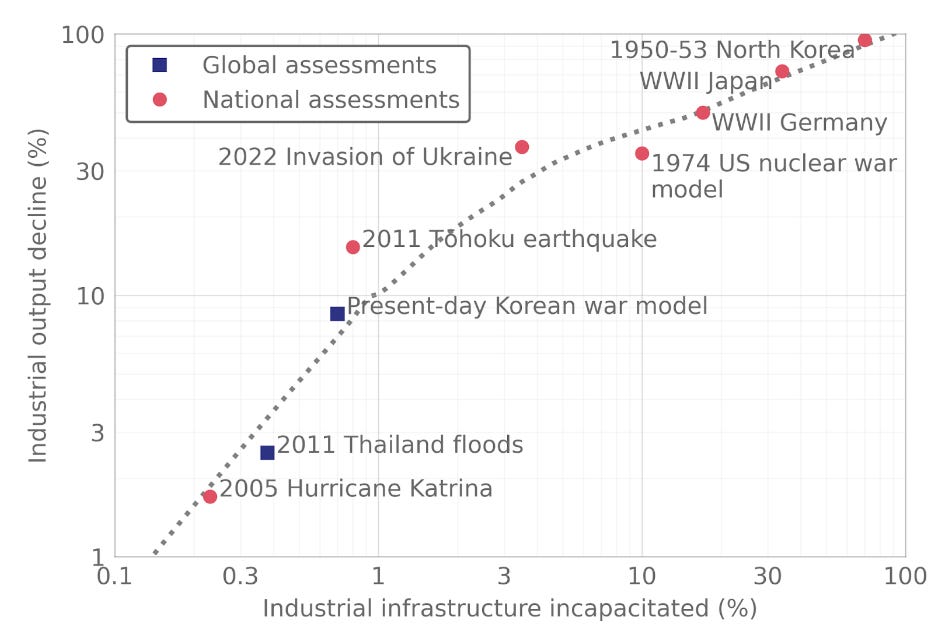 A paper that looks more systematically into the impacts of industrial destruction is by Blouin et al. (2024) (Disclaimer: I am a co-author on this one). The general idea is that, while we cannot easily assess the damages a nuclear war might do to industrial output, we can look into history, to find case studies of how destruction of industry leads to declines in industrial outputs and extrapolate from this. These case studies reach from major hurricanes to the Second World War (Figure 1).