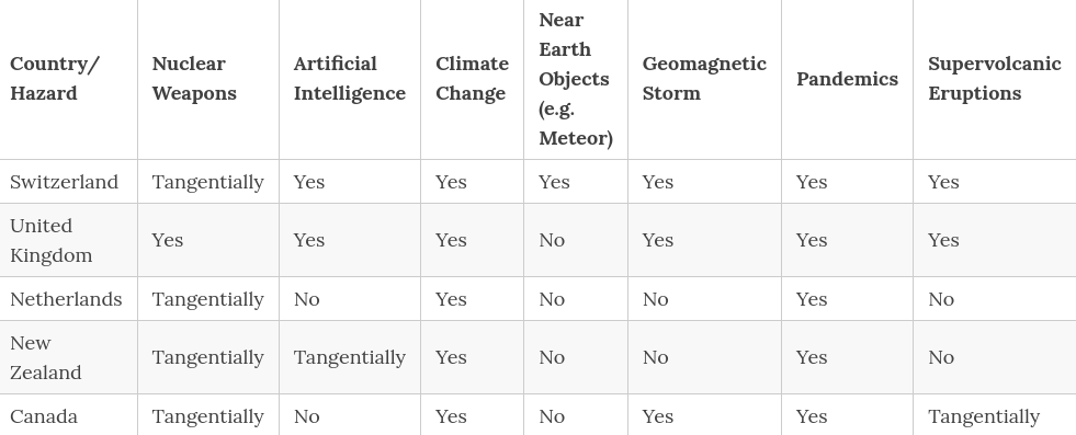 There is evidence that at least some states treat global catastrophic risk as a serious object of national planning, with Switzerland standing out for the breadth and depth of its assessment. The United States is not included in this comparison, as it does not produce a single, consolidated national risk assessment; instead, relevant analyses are distributed across multiple agencies, making them difficult to evaluate as a coherent whole. That said, the United States is distinctive in having produced a risk assessment focused explicitly on global catastrophic risks, with plans for periodic updates on roughly decennial timescales.